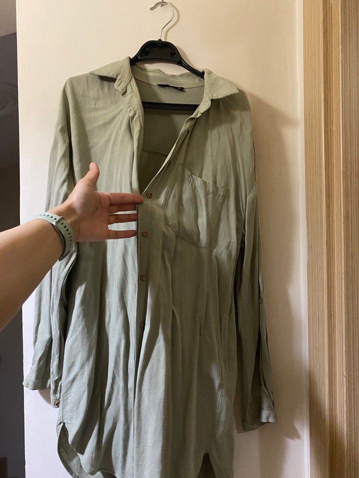Bol kesim, yakalı ve düğmeli khaki keten gömlek. Uzun kollu ve minimalist tasarımıyla günlük sokak stili için uygun.