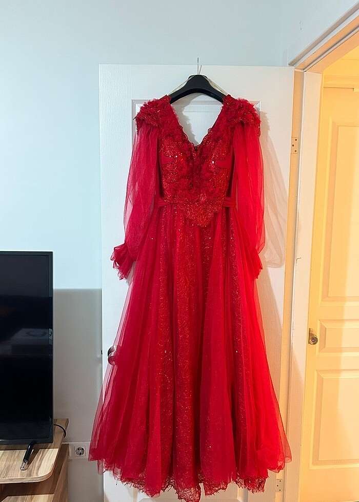 yalnızca birkaç saatliğine giyildi tesettüre de uydurulabilir 38 40 42 beden olarak giyilebilir belindeki kuşağın ayarlanması ile aynı renkte şalı da mevcut tül kumaşında kıyafetin giyilmiş fotoğrafı mevcut isterseniz ekleyebilirim fiyatta yardımcı olabilirim