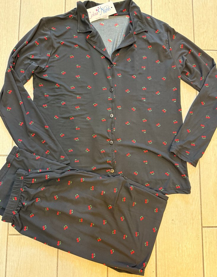 Siyah renkte, kırmızı kiraz desenli, uzun kollu ve midi boy, bol kesim kadın pijama takımı. Rahat ve sokak stiline uygun bir tasarım. Bedenleri vardır. #trendpijama #colournights #penti #dagi #suwen #m&s #koton #defacto #lcw #lcwdreams #export