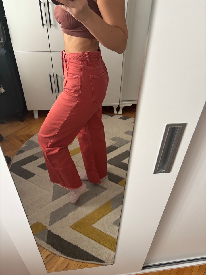 Kiremit kahve renkte, midi boyda ve bol kesim kot pantolon. Günlük rahat kullanım için desen içermeyen, zahmetsiz şıklık sunar.