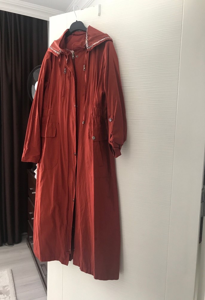 Kadın kiremit rengi yağmurluk, salaş kesim ve drapeli detaylarla. İpek gibi parlak kumaştan, uzun kollu ve minimal tarzda, günlük kullanım için uygundur