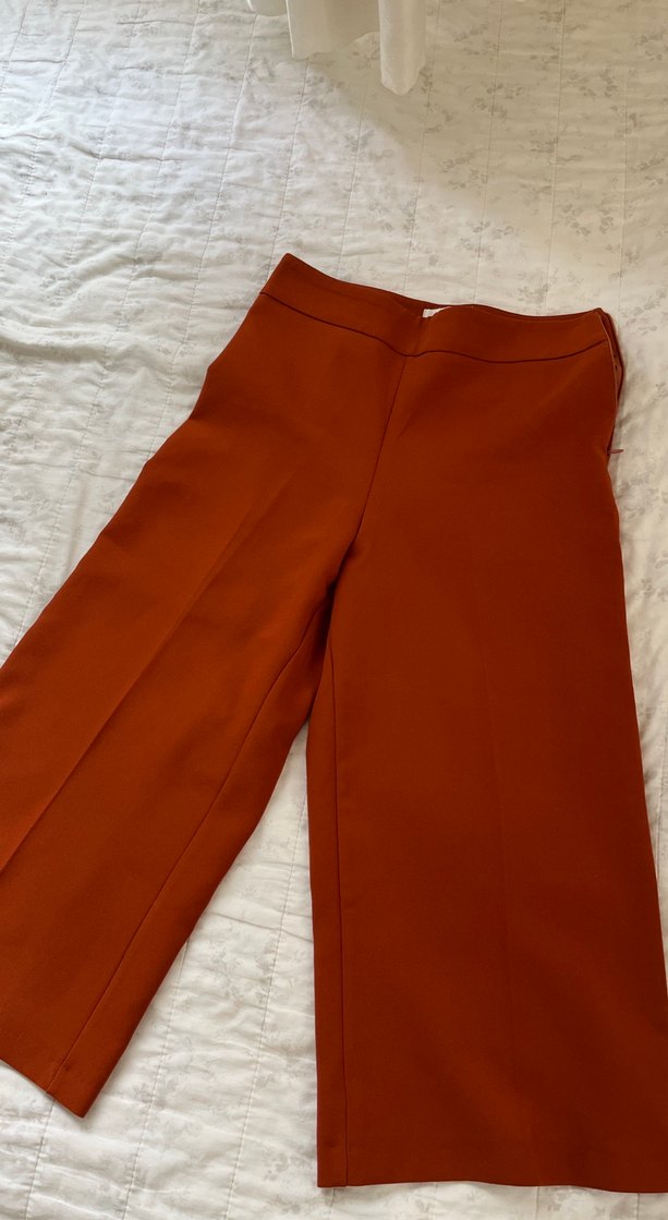 Hiç kullanılmadı tertemiz . Kadınlar için kiremit rengi midi boy kumaş pantolonlar, normal kesim ve parlak yüzeye sahiptir. Sentetik kumaştan üretilmiş, minimal ve normcore tarzıyla ofis için uygundur. ✨