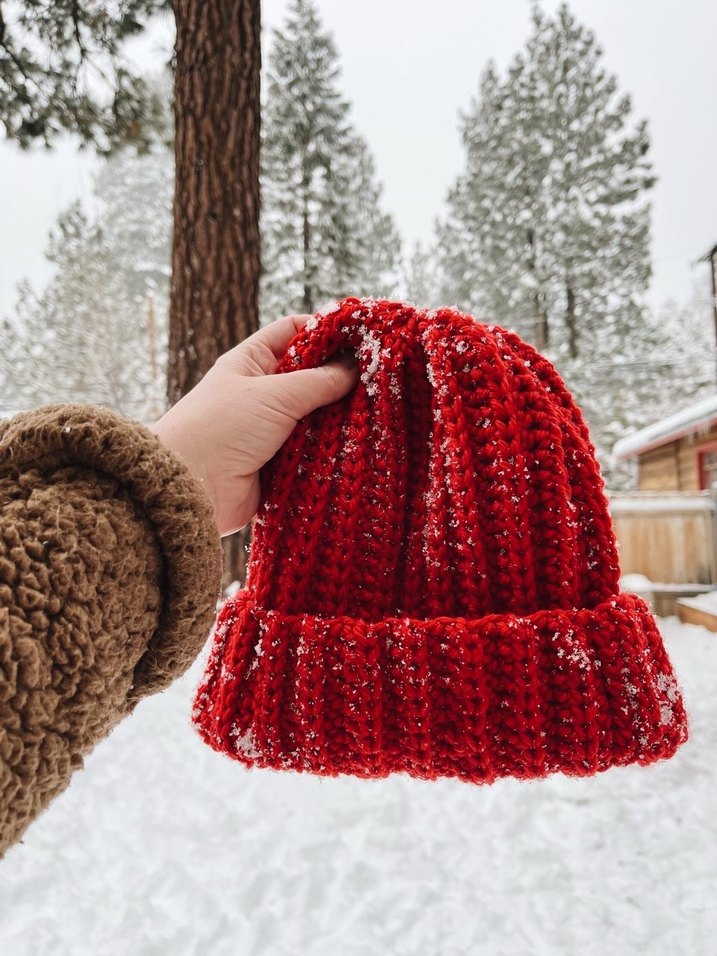 Kendim örüyorum. Kadınlar için kırmızı renkli, örgü kumaştan yapılmış, rahat ve sade tarzda, karşı kültür dokunuşlu bere.