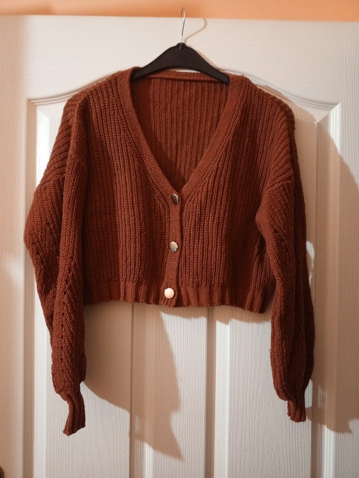 Kiremit renk örgü mini hırka, bol kesim, uzun kollu ve V-yaka detayına sahiptir. Rahat ve bohem tarzıyla günlük kullanıma uygundur. Boyu 40cm iki kol arası ölçüsü 57cm. Esnektir. Salaş giyimlerinizde kullanabilirsiniz. Zara ürünü değildir. Satın aldıktan sonra lütfen iade talebinde bulunmayınız.