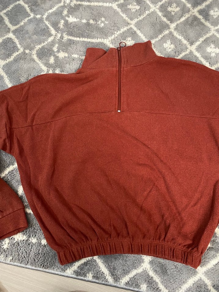 Kadınlar için yüksek yakalı, yarım fermuarlı, bol kesim uzun kollu, yumuşak ve sıcak kiremit rengi sweatshirt. Günlük rahat kullanıma uygundur.