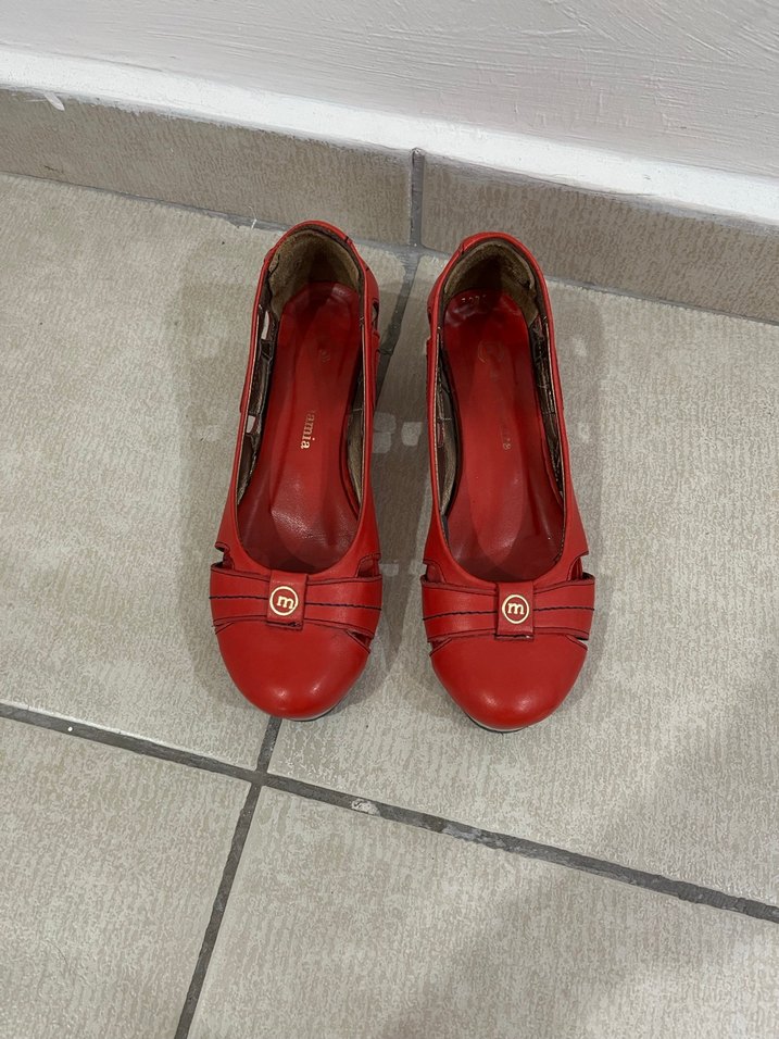 Kırmızı tokalı, dolgu topuklu kadın babetleri, dayanıklı kauçuk malzemeden yapılmıştır. Minimalist ve günlük kullanıma uygundur.