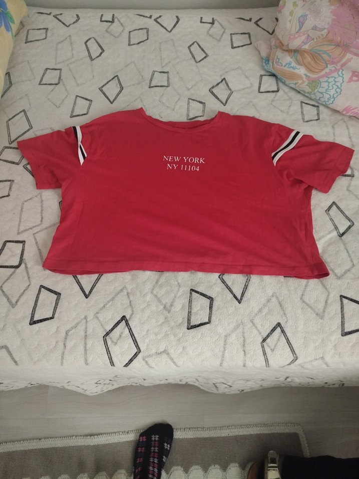 kadın ı için bol kesim, kısa kollu ve yuvarlak yaka crop . Sentetik kumaştan, kırmızı renkli, baskılı ve kol detaylarında çizgili, rahat ve şık sokak stili sunar.