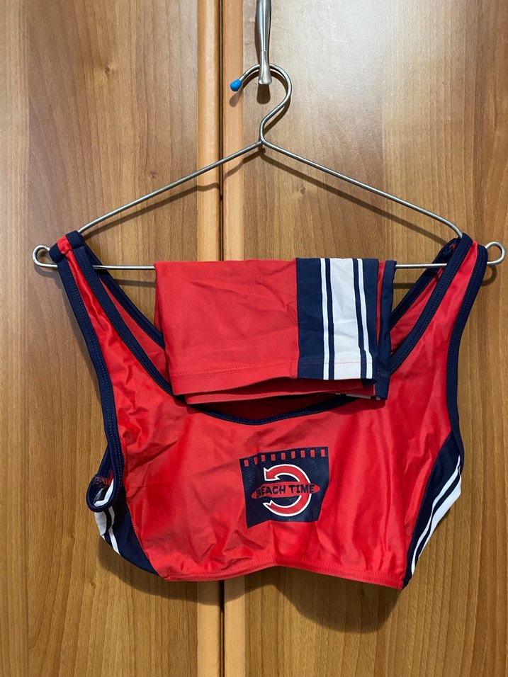 Kadınlar için kırmızı, parlak baskılı mini spor mayo, ince askılı ve yapışkan detaylı , şortlu