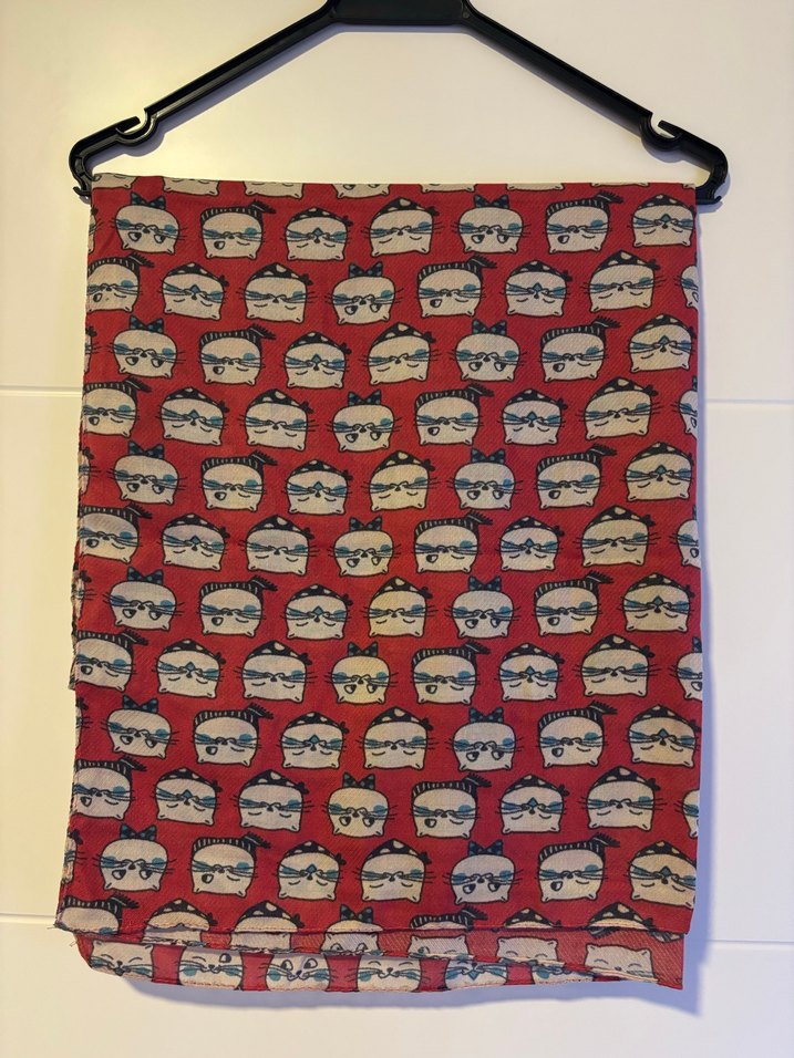koyu kırmızı renkte, gözlüklü retro yüz desenli baskılı atkı. Midi uzunlukta ve bohem, hippie tarzını yansıtıyor.