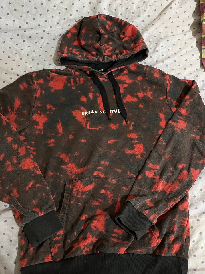 Koyu kırmızı batik desenli kapüşonlu sweatshirt, uzun kollu ve bol kesim. Ön cep ve siyah manşetlerle rahat bir görünüm sunar. Göğüste yazısı bulunur.