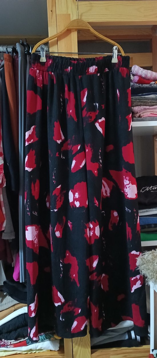 Kadınlar için uzun, bol paça pantolon, koyu kırmızı batik desenli sentetik yumuşak kumaştan yapılmıştır. Günlük kullanıma uygun bohem ve rahat bir tarza sahiptir.