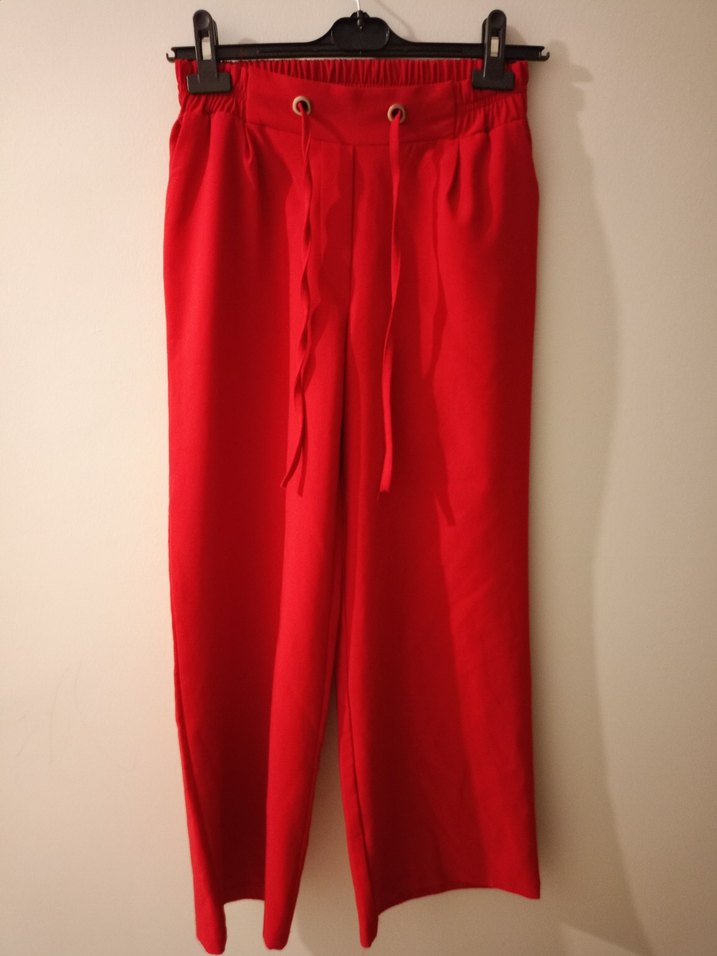 Kadınlar için kuşaklı beli ve midi boyda, sentetik kumaştan yapılmış kırmızı rahat kesim pantolon. Günlük kullanıma uygun parlak görünümlü.
