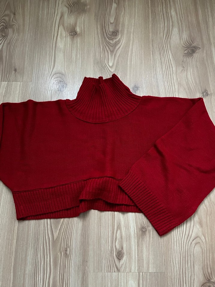 boğazlı, uzun kollu, yumuşak triko kumaştan yapılmış koyu kırmızı kısa ve bol kesim kazak.