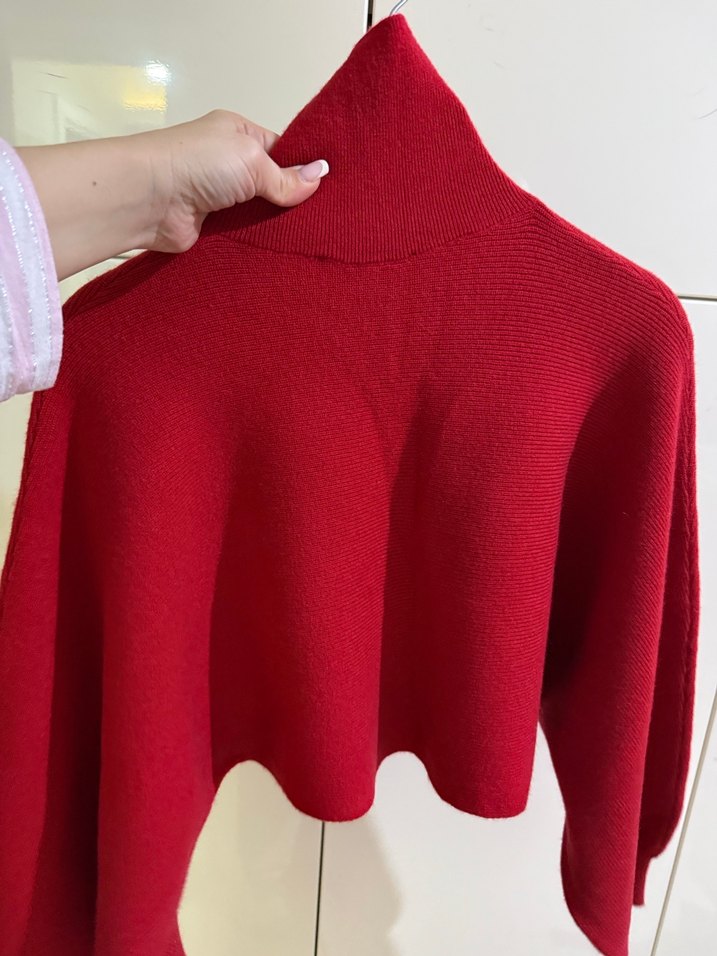Kadınlar için kırmızı, boğazlı, uzun kollu, yün örme kumaştan yapılmış, parlak ve vücuda oturan normal midi uzunlukta kazak. Günlük kullanıma uygun.
