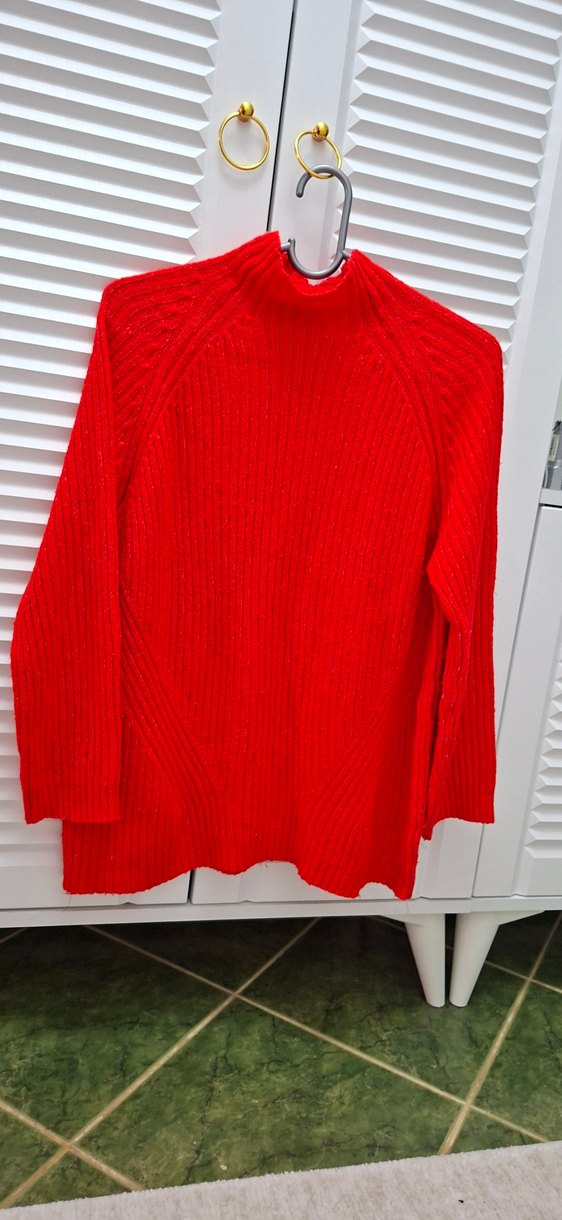 Boğazlı ve uzun kollu, salaş kesim kırmızı triko kazak, rahat ve renkli bir tarz sunar.