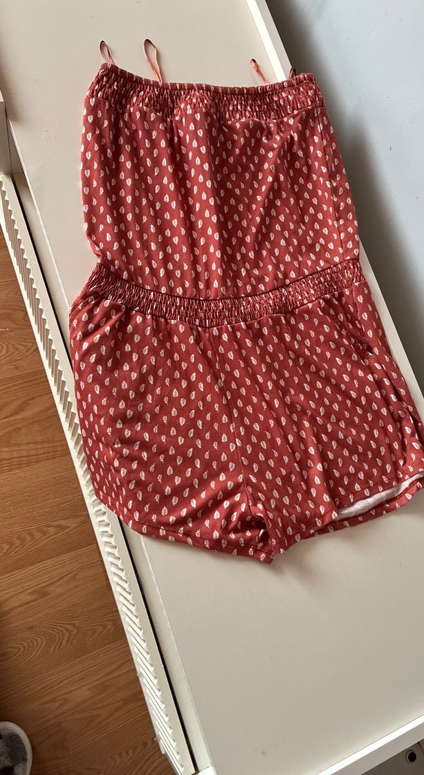Kadınlar için tasarlanmış bu kırmızı bohem mini tulum, bol kesim ve pile detaylarına sahiptir. Askısız ve kolsuzdur, yumuşak pamuktan üretilmiştir.
