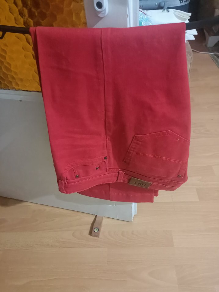 Kirmızı renkte, İspanyol paça düğmeli detaylara sahip kadın kumaş pantolon. Günlük rahat sokak stili için uygundur.