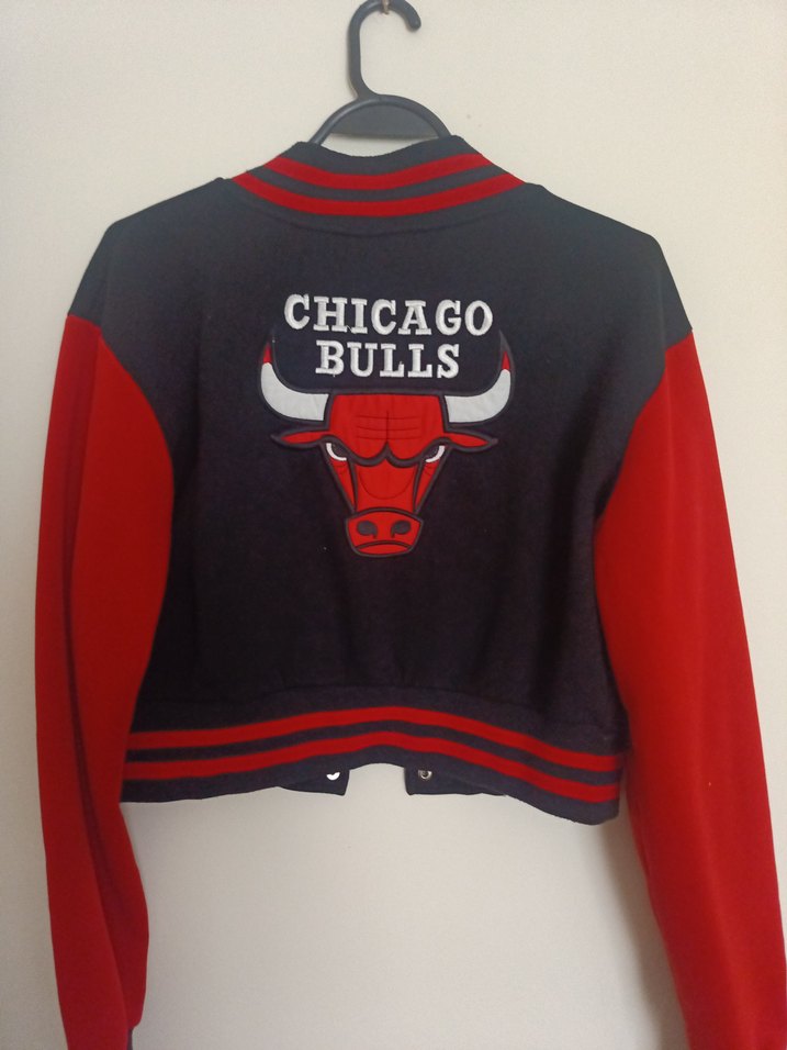 Kadınlar için fitted kesim, uzun kollu ve yuvarlak yakalı, Chicago Bulls baskılı kırmızı bomber ceket. Yumuşak kumaştan, düğmeli ve normal boyda, sportif sokak stili için uygun.