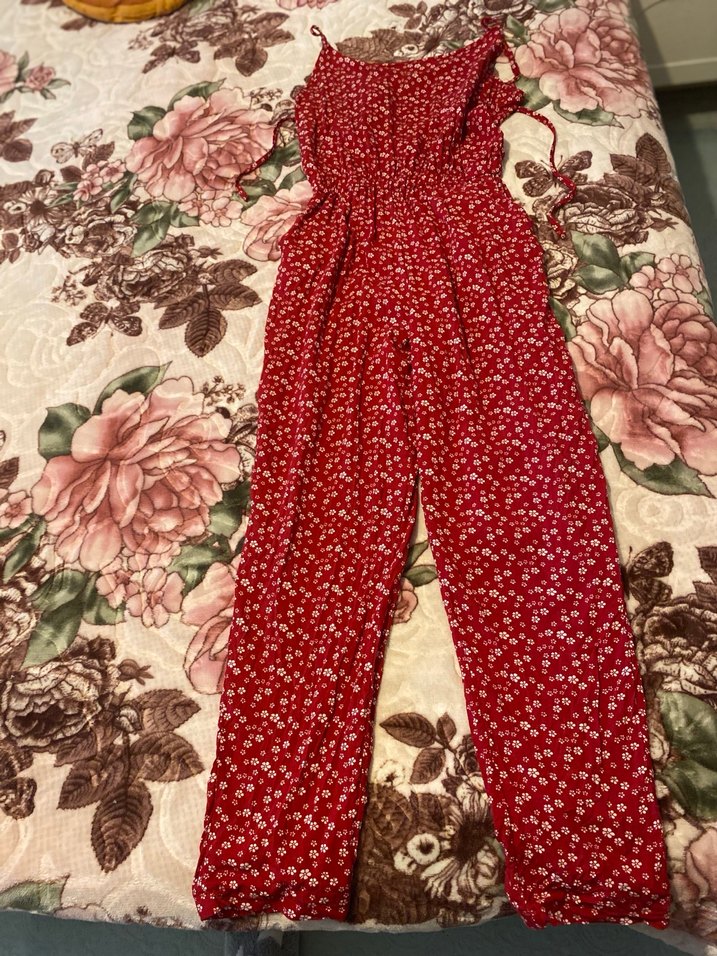 Kadınlar için uzun, bol kesim tulum, ince askılı ve düğmeli. Canlı kırmızı çiçekli deseni ve sentetik kumaşıyla gündelik kullanıma uygun.
