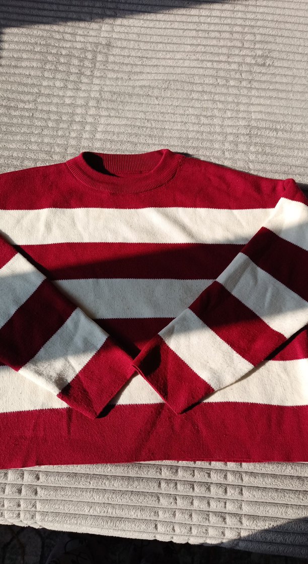 Kadın triko kazak, uzun kollu ve yuvarlak yakalıdır. Kırmızı-beyaz çizgili ve rahat kesimlidir. Günlük rahat kullanıma uygundur.