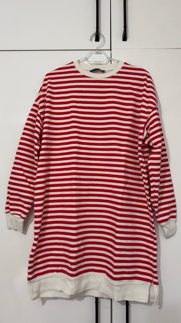 Uzun kollu, yuvarlak yakalı kadın tunik Gevşek kesim, midi boy ve kırmızı çizgili desene sahip. Yumuşak ve sıcak kumaştan, rahat ve şık sokak stili sunar.