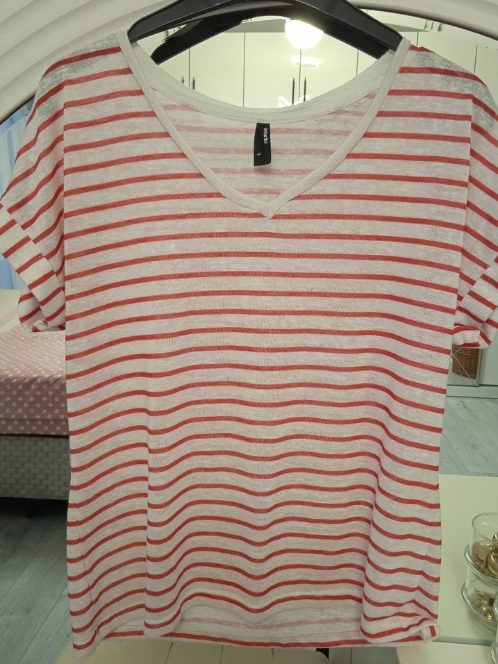 Kadınlar için kırmızı-beyaz çizgili, V yakalı ve kısa kollu pamuklu tişört. Rahat kesimiyle günlük sokak stiline uygundur.