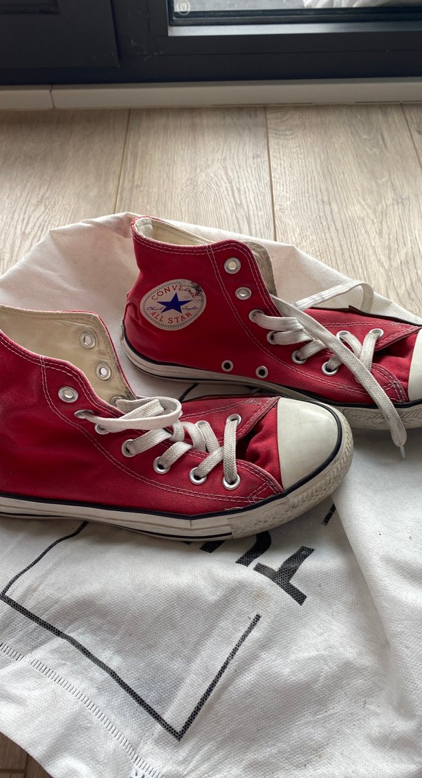 Kırmızı Converse yüksek tabanlı spor ayakkabılar, düz kauçuk tabanlı, gündelik kullanım için renkli ve zahmetsiz şıklık sunar. Desensiz, trend athleisure tarzına uygun. Ürünün bağcıkları orijinal değildir.