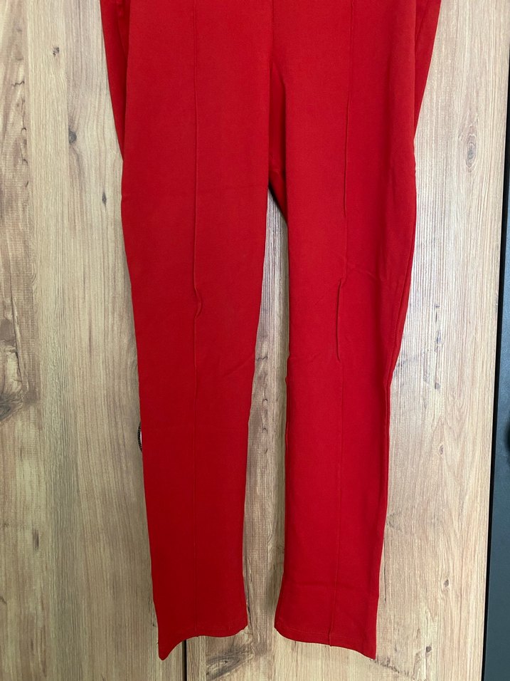 Kadınlar için parlak kırmızı renkte, dar kesim ve fermuarlı detaylı uzun kumaş pantolon, ofis kullanımı için uygundur.