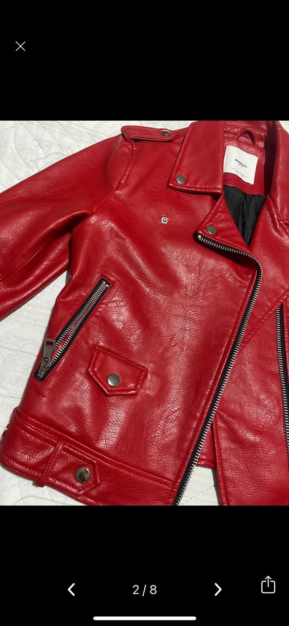 Fitted kırmızı deri biker ceket, çıtçıtlı yakalı, fermuarlı cepler ve askılı kollara sahip, sokak stili için uygun. Yaka kısmında soyulmalar var