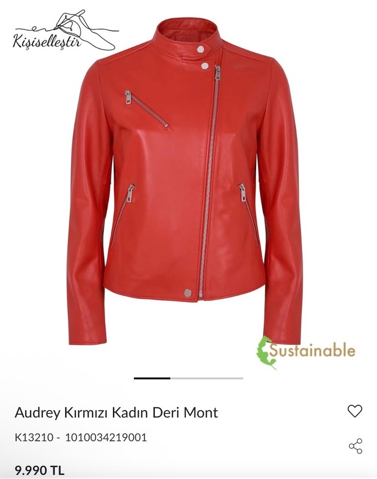 Parlak kırmızı deri biker ceket, fermuarlı cepler ve kesik yakaya sahip. Uzun kollu ve midi boyda, günlük kullanıma uygun.