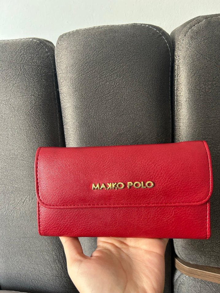 Kırmızı deri kadın cüzdanı, tokalı kapama ve Maxko Polo baskılı desene sahiptir. Modern klasik tarzıyla günlük kullanıma uygundur.
