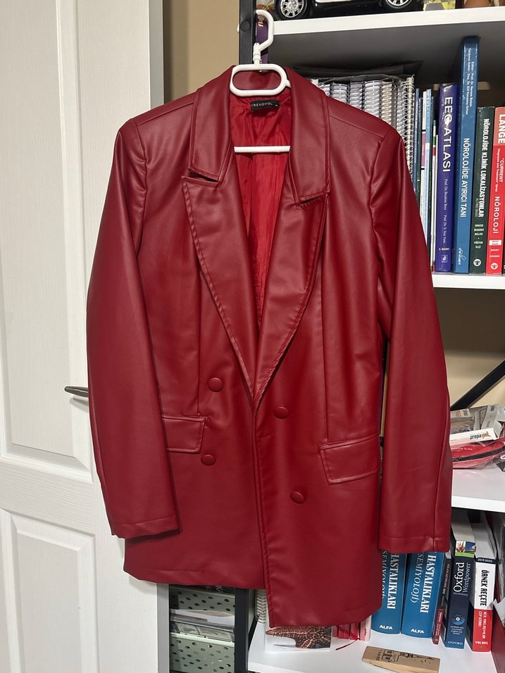 Kadınlar için kırmızı, parlak deri midi ceket, düğmeli ve kesimli yaka detaylıdır. Uzun kollu ve normal kesimdir, iş veya sokak stili için uygundur. Aşık olarak aldığım fakat hızlı kilo alımı ve zayıflayamama sebebiyle satmak zorunda kaldığım o ceket… Soğuk havalar için uygun değildir