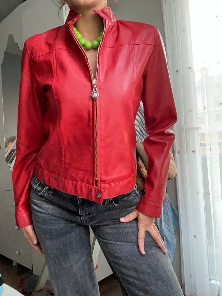 Parlak kırmızı deri, fermuarlı, yüksek yakalı, normal boy ve uzun kollu, dar kesim kadın ceket. Günlük rahat sokak stili için uygundur.