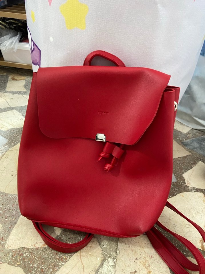 Kırmızı deri sırt çantası, tokalı kapak ve desen içermeyen minimalist tasarıma sahip, günlük sokak stiline uygun.
