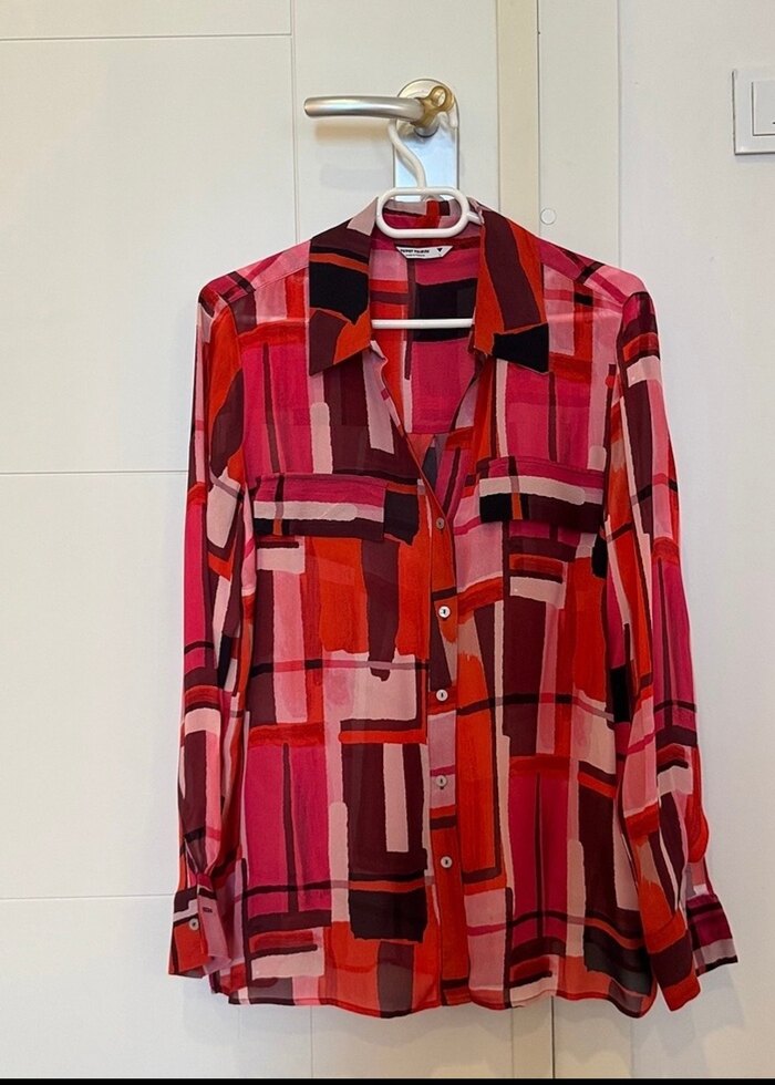 Kadınlar için bol kesim, uzun kollu, yakalı ve düğmeli kırmızı tonlarında desenli gömlek. Sentetik kumaştan, günlük kullanıma uygun bohem tarzda.