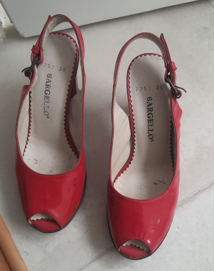 BARGELLO markalı, tokalı kayışlı kırmızı dolgu topuklu kadın abiye ayakkabı. Açık burun tasarımı ve rugan malzeme ile romantik akşamlar için uygundur. ❤️ 1-2 kez giyildi, ufak tefek kusurları olabilir, fotoğraflar nettir