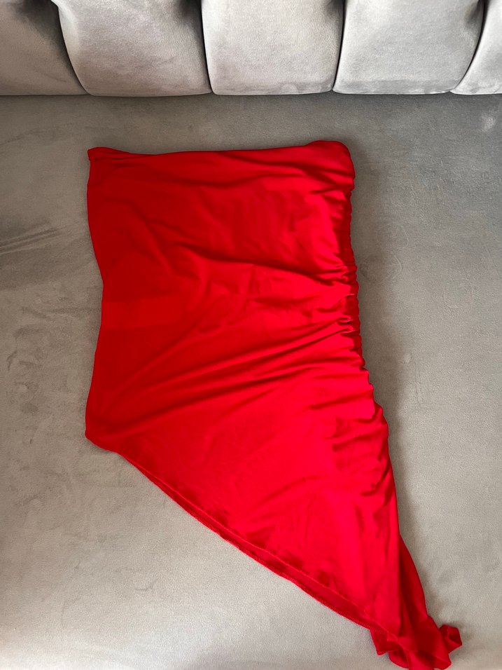 Kadın Kırmızı Drapeli Asimetrik Straplez Bluz
