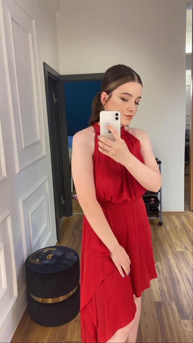 Kadın Kırmızı Drapeli Midi Abiye Elbise