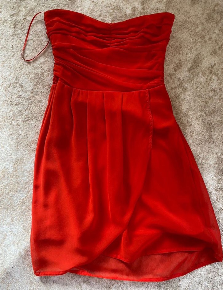 Kırmızı, straplez, drapeli ve fit kesim midi elbise. Parlak dokusuyla modern klasik tarzda, romantik gece için uygundur. Kolsuz ve desensiz tasarım.
