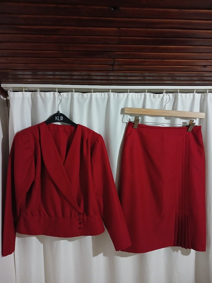 Kadın kırmızı takım, drapeli tasarımı ve kesik yaka detaylarıyla dikkat çeker. Uzun kollu, midi boy etek ve gabardin ipeksi kumaştan yapılmıştır. Ofis için uygundur.