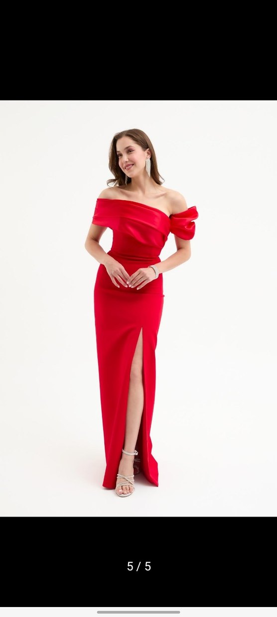 Kadın Kırmızı Drapeli Uzun Abiye Elbise