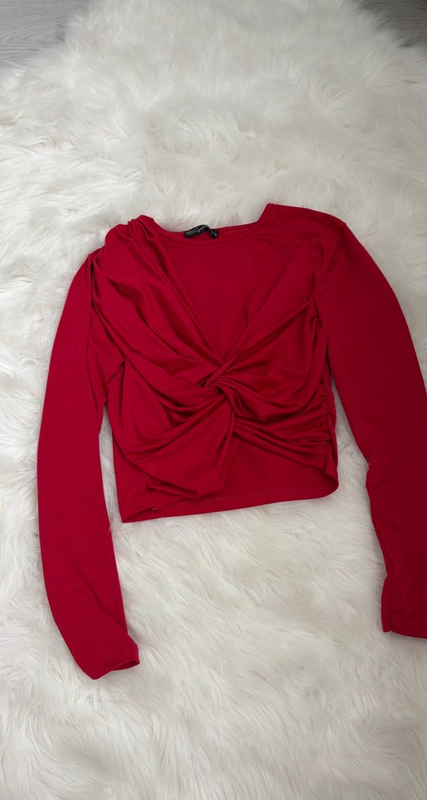 Kadınlar için uzun kollu, drapeli ve kısa kesim kırmızı bluz. Yumuşak ve sıcak kumaştan, sokak stili için cesur ve rahat bir seçenek sunar.