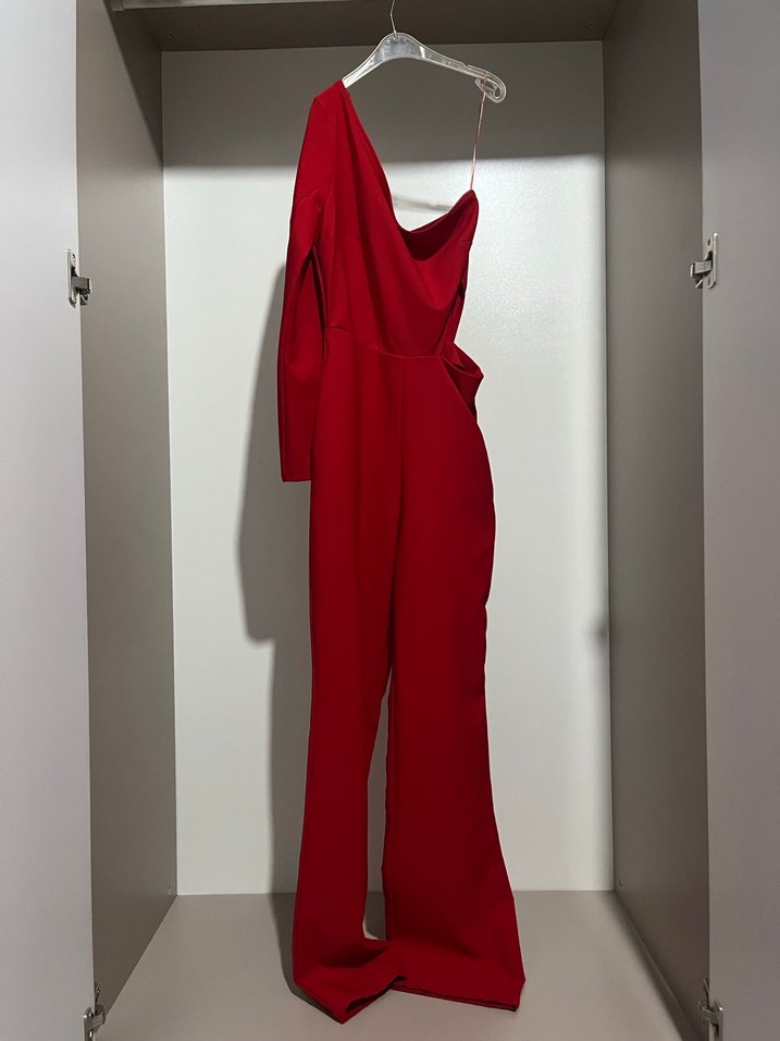 Kadınlar için drapeli tasarıma sahip, tek askılı ve straplez yaka uzun tulum. İpeksi kumaştan yapılmış, kırmızı renkte, romantik akşamlar için uygun. ❤️
