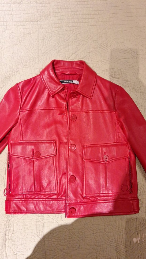 Kadın Kırmızı Düğmeli Deri Ceket.