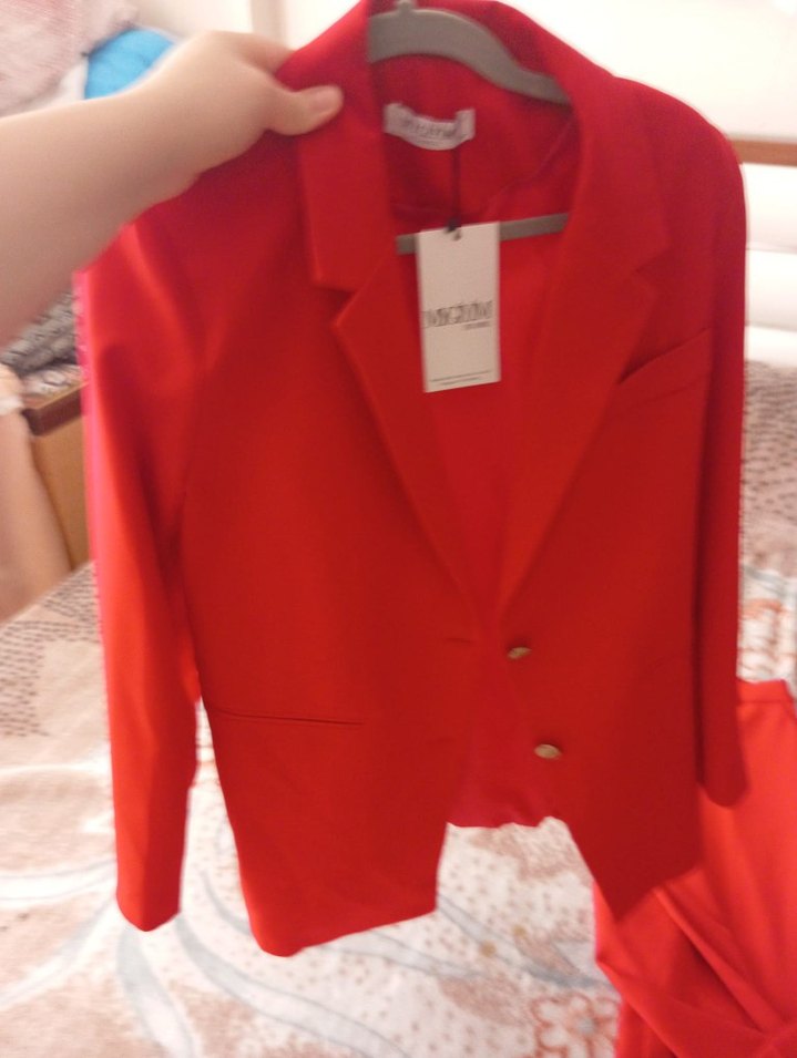 Kadınlar için kırmızı, düğmeli, normal uzunlukta midi blazer. İpek dokulu, uzun kollu ve parlak renkte, ofis ve günlük kullanıma uygun. ürün sıfır etiketli