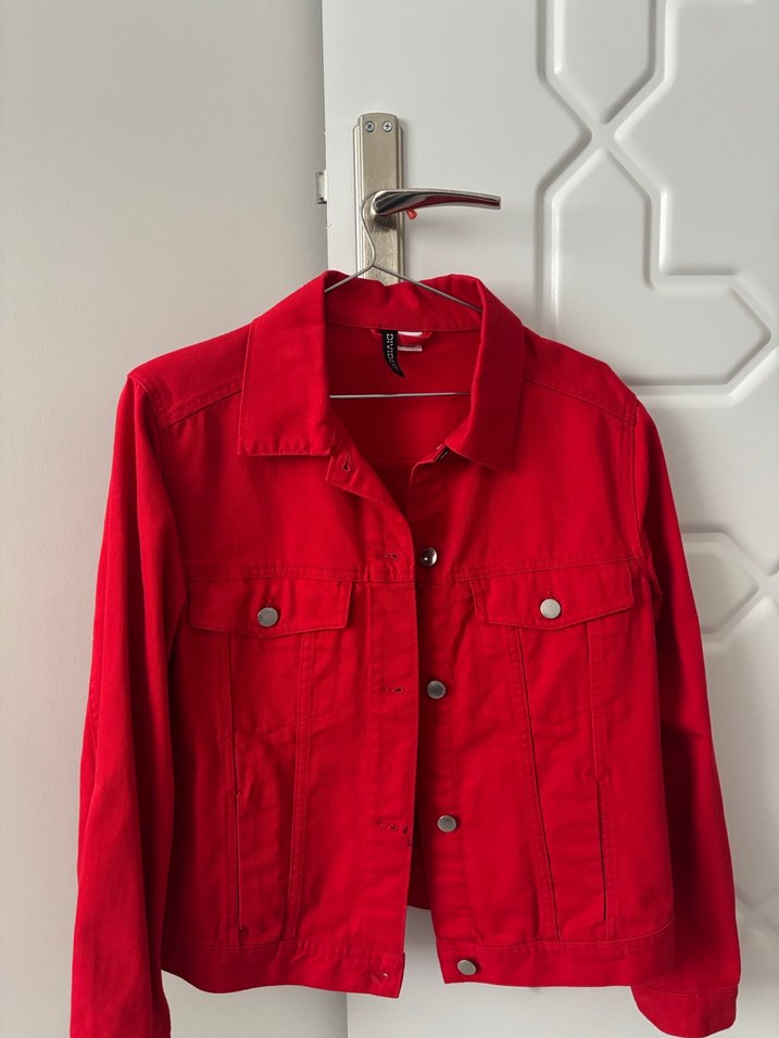 Kadınlar için kırmızı, düğmeli, normal boy midi denim ceket. Notlu yaka ve uzun kollu, keten kumaştan, parlak görünümlü. Minimalist sokak stili için uygun.