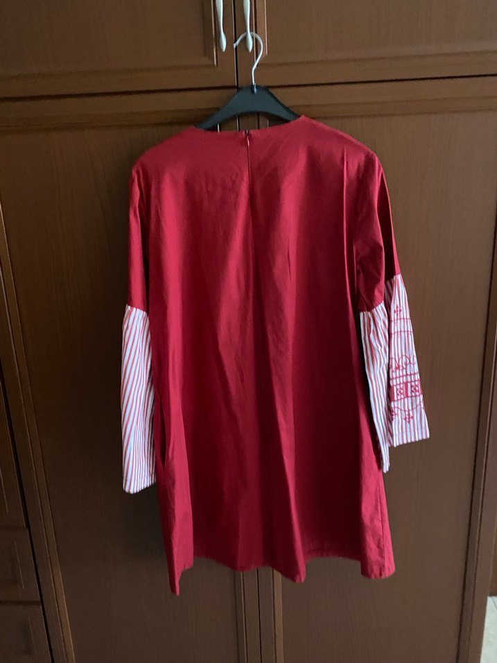 Kadın kırmızı tunik, uzun kollu ve düğmeli çizgili manşetlere sahip. Yuvarlak yakalı, rahat kesimli ve baskılı desendir. Bohem ve retro tarzda.