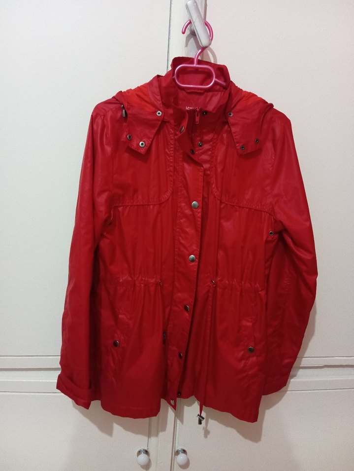 Kadınlar için parlak kırmızı renkte, düğmeli midi yağmurluk . Sentetik kumaştan, uzun kollu günlük rahat kullanım için uygun. çok temizdir