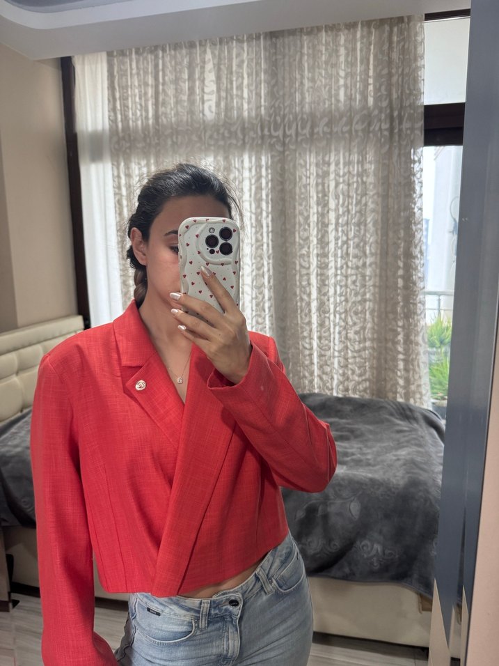 Kadın kırmızı blazer, parlak sentetik kumaştan, kruvaze yakalı ve düğmeli. Normal kesim, uzun kollu, günlük sokak tarzı için uygun.