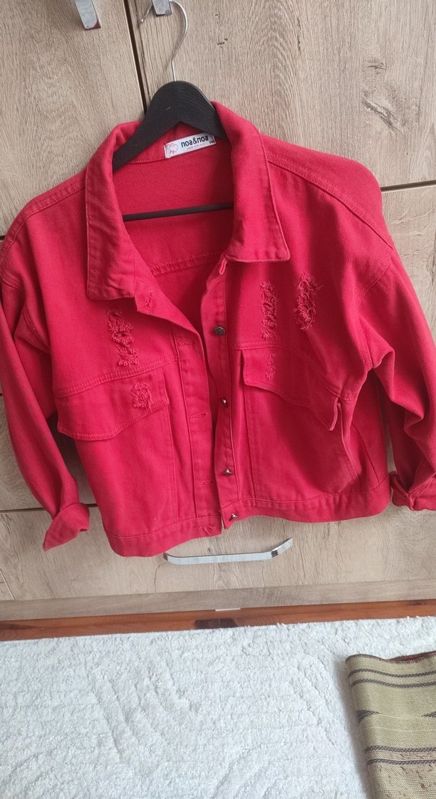 Kadınlar için kırmızı, parlak görünümlü, düğmeli mini kot ceket. Bol kesim, uzun kollu, yaka detaylı ve günlük rahat kullanım için keten kumaştan.